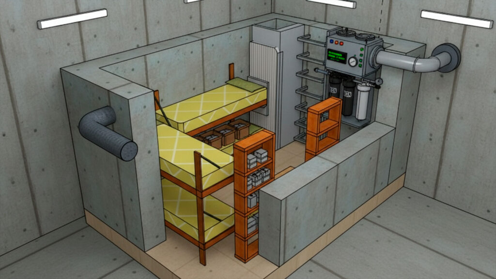 Un bunker autosuficiente moderno cuenta con un sistema de filtración NBC (nuclear, biológica y química), con filtros de carbono activado y presión positiva interior.